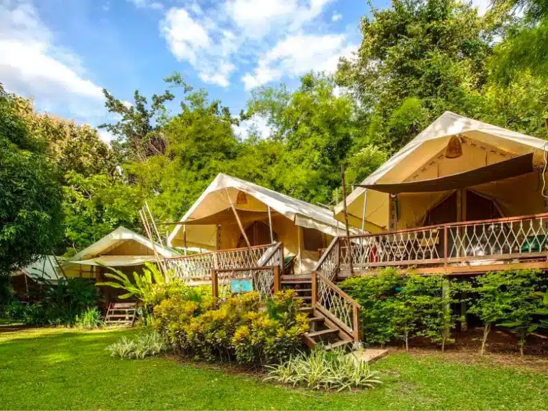 Oplevelsen ved River Kwai bliver ekstra mindeværdig med overnatning på to meget forskellige steder. Først venter en nat i den prisvindende Hintok River Camp, en luksuriøs teltlejr omgivet af jungle og med egen naturpool ved floden. Herefter bor du på det ikoniske The FloatHouse River Kwai, et flydende resort hvor rummelige villaer ligger direkte på vandet og giver en helt særlig atmosfære. Kombinationen giver både eventyr og komfort – tæt på naturen, men uden at gå på kompromis med oplevelsen.